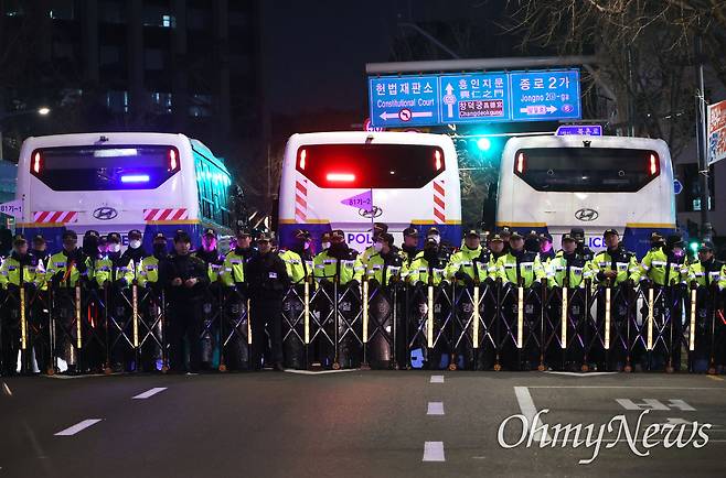 | ▲ 31일 오후 서울 종로구 광화문앞에서 열린 ‘내란수괴 윤석열 즉각 파면 행진’에 참석한 시민들이 헌법재판소앞을 향해 행진하자, 경찰이 안국역 부근에 버스로 차벽을 설치해 대비하고 있다. |