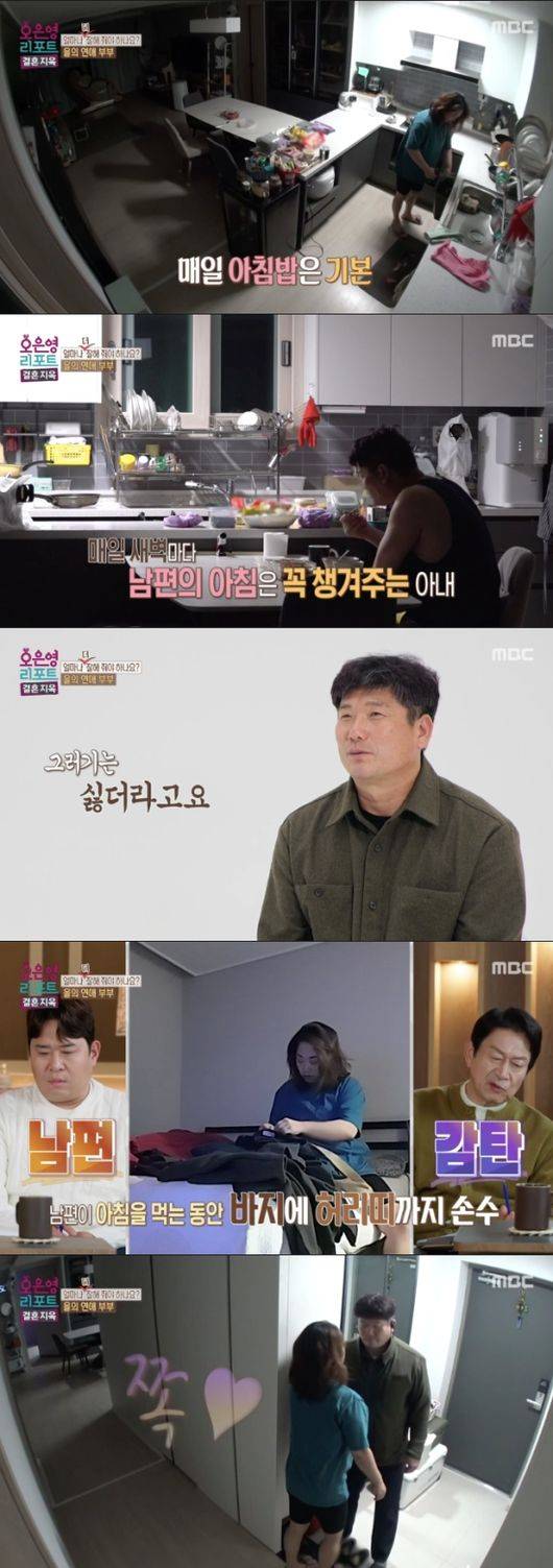 남편은 익숙하다는 듯 일어나서 식탁으로 향했고 “일하러 가야 해서 아침밥을 안 먹으면 안 된다. (챙겨서 먹기는) 싫더라”라고 했다. 남편이 밥 먹는 사이 아내는 남편의 바지에 허리띠까지 끼워두었다.