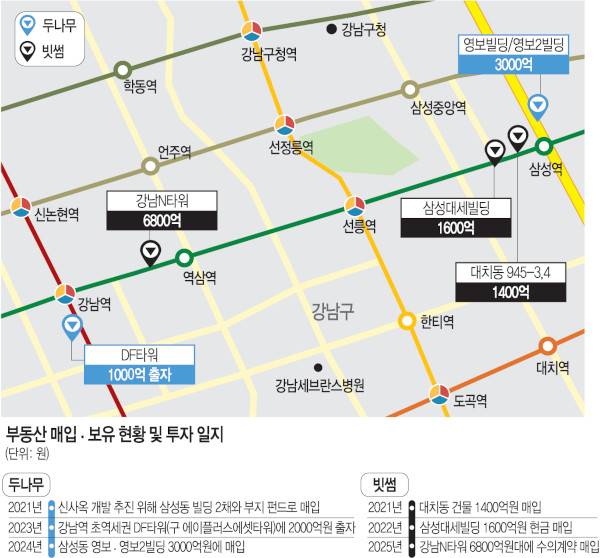 가상자산 업계 1위 두나무도 마찬가지다. 두나무는 2023년 코람코자산신탁이 4300억원을 들여 리츠를 통해 매입한 DF타워(옛 에이플러스에셋타워)에 1000억원을 출자했고, 2024년에는 삼성역 인근 영보·영보2빌딩을 3000억원대에 매입했다. 2021년에 인수한 삼성동 부지에서 신사옥 개발도 준비 중이다. 두나무와 빗썸이 이렇게 최근 5년 동안 매입한 건물은 6곳에 달한다. 모두 강남대로와 테헤란로를 중심으로 강남구, 서초구, 송파구 일대의 업무지구에 위치한다.