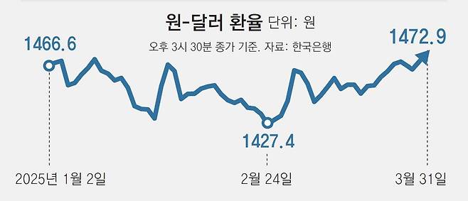 서정훈 하나은행 연구원은 “미국의 관세 전쟁으로 인한 글로벌 불확실성 증가와 미국 경기 침체, 국내 정치 불안 등이 겹치면서 원화 가치가 급락하고 있다”며 “최악의 경우 다음 달 원-달러 환율이 1500원을 넘어설 수 있다”고 전망했다.