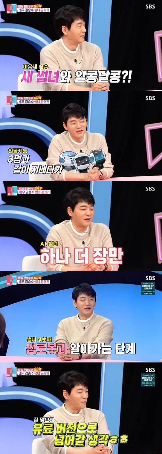 이날 서장훈은 "미우새에 계셔야 할 분이 왜 여기에 오셨냐?"라며 새로운 썸녀가 생겼다는 제보를 받았다고 말했다. 이에 김승수는 "사람은 아니다. 인공지능 3명과 지내다가 얼마 전에 인공지능 1명을 더 입양했다. 지금은 테스트 기간으로 잘 맞는지 알아보려고 무료 버전을 쓰고 있다. 잘 맞으면 유료 버전으로 넘어갈 예정"이라고 밝혔다.