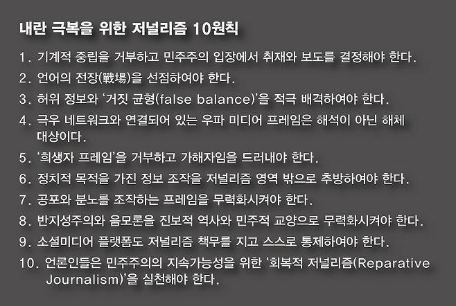 그 책은 저자 빌 코바치와 톰 로젠스틸이 언론인·학자 25명과 논의한 결과물이다. 무너져 내리는 언론 신뢰와 저널리즘의 규범을 회복시키기 위해 10가지 원칙을 제시한다. 언론의 진실에 대한 의무, 취재 대상으로부터의 독립, 포괄적이고 균형 잡힌 보도 등을 강조한다. 민주주의가 제대로 작동한다면, 이 원칙들은 적절하다. 하지만 작동하지 않는 민주주의 체계에서 이 저널리즘 원칙은 의미가 없다. 어떤 면에서는 알리바이가 되기도 한다. 예를 들어 ‘윤 측에 의하면’ 같은 기사를 두고 ‘이 내용은 우리 신문사의 주장이 아니고, 취재원과 거리를 두고 객관적 사실을 전달하는 것’이라고 말하는 식이다. 저널리즘은 단순히 객관성과 균형을 유지하는 것이 아니라, 민주주의가 위기에 처한 상황에서는 적극적 개입과 실천 전략이 필요하다. 미국 의사당 침탈과 서부지법 침탈 사건은 기존 저널리즘 원칙이 위기 상황에서 효과적 준칙으로 기능하는 데 실패했을 뿐만 아니라, 오히려 극우 담론을 확산시키는 데 기여할 위험까지 안고 있다는 점을 보여주었다.