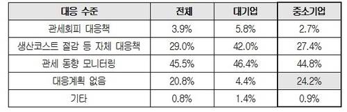 이런 상황에도 국내 기업들의 대응은 제한적이다. 관세에 대한 대응 현황을 묻자 '동향 모니터링 중'(45.5%)이거나 '생산비용 절감 등 자체 대응책을 모색 중'(29.0%) 인 기업이 74.5%였다. 그보다 더 근본적인 대응책인 '현지 생산이나 시장 다각화 등을 모색 중'인 기업은 3.9%에 그쳤고, '대응 계획이 없다'고 답한 기업은 20.8%였다.