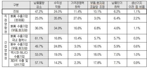 국내 기업들은 미국 관세의 영향으로 '납품 물량 감소(47.2%)'를 가장 많이 우려했다. 미국에 직접 수출하지 않더라도 간접 영향권에 속한 기업이 많기 때문으로 분석됐다. 이어 '고율 관세로 인한 수익성 악화'(24.0%), '미국 시장 내 가격 경쟁력 하락'(11.4%), '부품·원자재 조달망 조정'(10.1%), '납품단가 하락'(6.2%) 등이 뒤를 이었다.