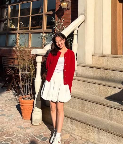 사진 속 진지희는 흰 원피스에 빨간 카디건을 매치하고 카메라를 향해 포즈를 취하고 있다.