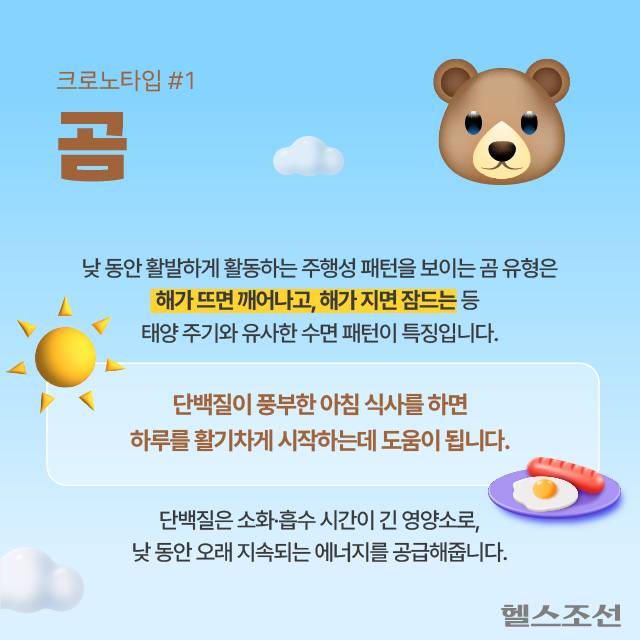 크로노타입 #1 곰낮 동안 활발하게 활동하는 주행성 패턴을 보이는 곰 유형은해가 뜨면 깨어나고, 해가 지면 잠드는 등태양 주기와 유사한 수면 패턴이 특징입니다.