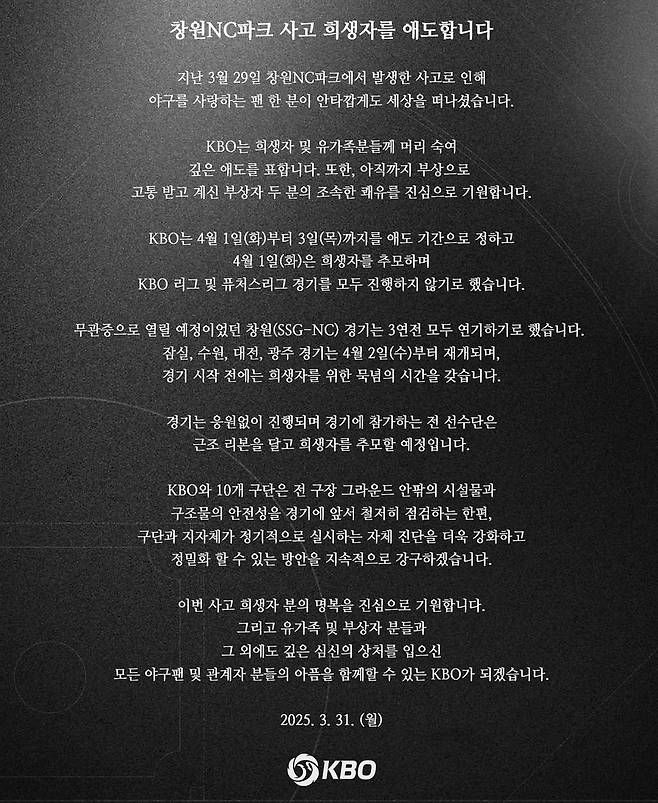 사망 비보에 KBO는 4월 1일 퓨처스리그 포함, KBO리그 전 경기를 실시하지 않기로 하루 전인 3월 31일 오후 전격 발표 했다. 창원에서 열릴 예정이었던 1~3일 3경기는 당초 무관중으로 열릴 예정이던 1~3일 창원 3경기는 전면 취소됐다. 창원 NC파크는 4월 1일 부터 정밀 안전 진단에 들어갔다.