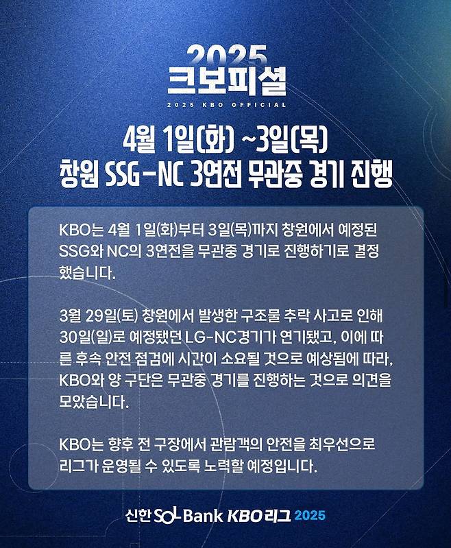 4월 1일부터 3일까지 창원 NC파크에서 열릴 예정이던 NC 다이노스와 SSG 랜더스의 3연전이 연기됐다. 당초 이번 시리즈는 무관중 경기로 진행을 할 예정이었다.