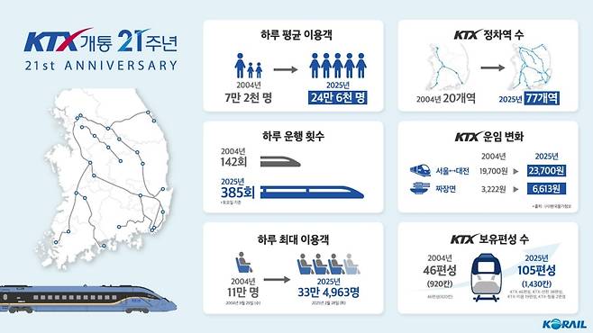 2025년 기준 KTX 하루 평균 이용객은 24만6000명이다. 개통 첫해 7만2000명과 비교하면 3.4배 늘었다. 하루 운행횟수도 개통 초 142회에서 올해 385회로 2.7배 증가했다.