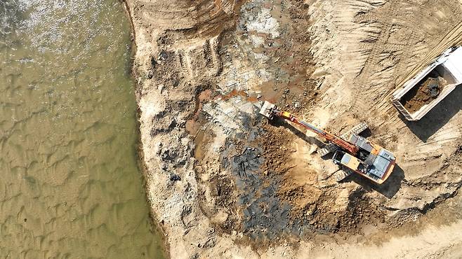 | ▲ 강 우안의 모래톱에서 대대적인 준설공사가 행해지고 있다. |
