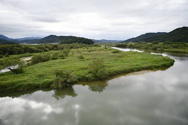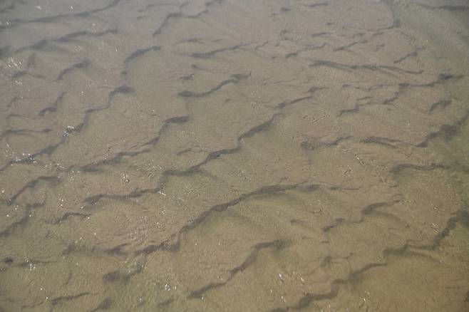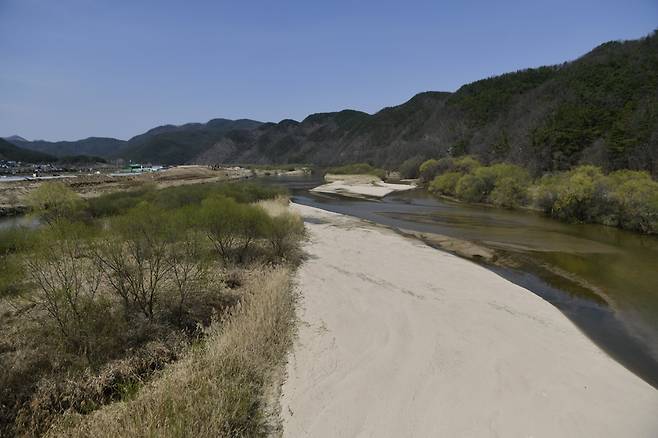 | ▲ 황강의 아름다운 모래톱 위를 맑은 강물이 흘러간다. 한폭의 그림이 완성된다. |