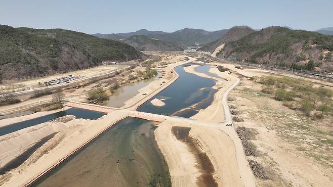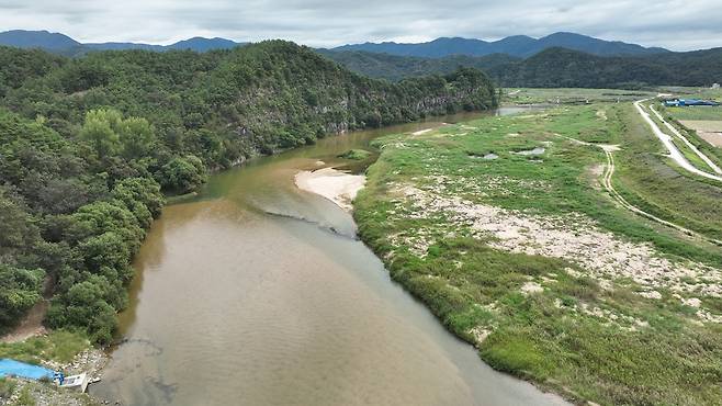 | ▲ 황강 건태지구에 하천공사가 진행되기 전인 지난 2024년 9월의 모습이다. 저 아래 모래톱에서 대대적인 준설공사가 행해지고 있다. |