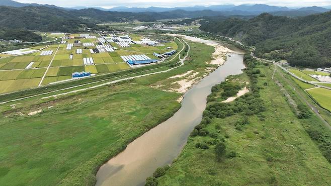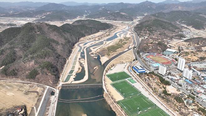 | ▲ 강의 좌안에 들어선 체육시설로 하천폭이 좁아져 병목현상을 보이고 있는 용주지구 황강. |