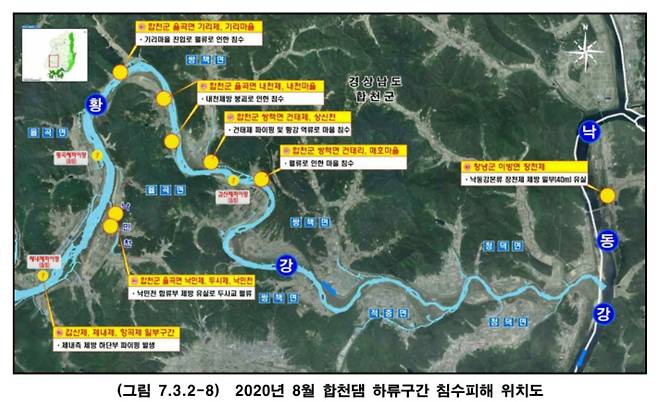 | ▲ 황강 하천정비사업 환경영향평가서에 나와 있는 홍수피해 지역들. 황강의 제방과 지천의 제방으로 물어 넘어 홍수가 발생했다는 내용이 주다. |