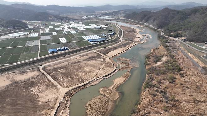 | ▲ 황강 죽고지구의 하천공사 전인 지난 2024년 9월의 모습이다. 하상이 전체적으로 높지 않는 이런 곳에서도 대대적인 준설공사가 이루어지고 있다. |