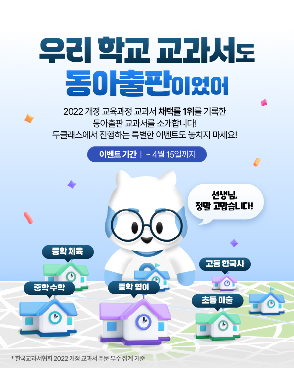 한국교과서협회 2022 개정 교육과정 교과서 주문 부수 집계 결과에 따르면, 동아출판은 ▲초등 미술 ▲ 중학 영어 ▲ 중학 수학 ▲ 중학 체육 ▲ 고등 한국사 총 5개 과목에서 채택률 1위를 기록했다. 이에 따라 교과서를 사용하는 선생님들에게 감사의 마음을 전하고자, 선생님 전용 수업 지원 플랫폼 '두클래스'를 통해 다양한 참여형 이벤트를 마련했다.