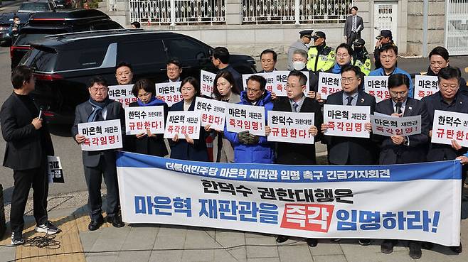 박찬대 원내대표는 마은혁 헌법재판관 후보자 미임명 등을 이유로 한덕수 대통령 권한대행 국무총리를 비판하기 위해 삼청동 총리공관 앞에서 한 회견에서 "4일에 선고하게 된 것을 그나마 다행이라고 생각한다"고 말했습니다.