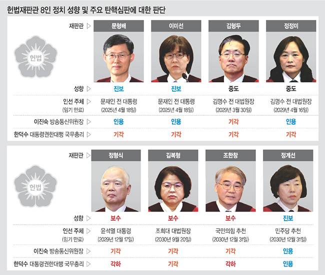 하지만 지난달 24일 한덕수 국무총리의 탄핵심판 과정에서 나타난 헌법재판관 사이의 의견 불일치로 윤 대통령 탄핵심판도 비슷한 양상을 보이는 것 아니냐는 관측도 힘을 얻고 있다. 당시 헌법재판관 중 보수 성향으로 분류되는 정형식·조한창 재판관은 ‘각하’ 결정을, 김복형 재판관은 ‘기각’ 결정을 내면서 한 총리가 위헌·위법을 저지른 바가 없다고 봤다. 중도 성향으로 알려진 김형두·정정미 재판관은 일부 위법이 존재하나 파면에 이를 정도가 아닌 것으로 봐 ‘기각’ 결정을 냈고, 진보성향을 띠는 문형배·이미선 재판관도 같은 이유로 ‘기각’ 결정했다. 가장 진보적 색채로 평가되는 정계선 재판관만 ‘인용’ 결정을 냈다. 이런 구도를 종합하면 보수 성향의 재판관 3인이 ‘기각’ 결정을 내는 ‘5대 3’ 구도나 이진숙 방송통신위원장 탄핵심판 선고처럼 ‘4대 4’가 나올 가능성도 있다. 대통령에 대한 파면 결정에 이르려면 헌법재판관 6인의 인용 결정이 필요하기 때문에 이 경우 윤 대통령에 대한 탄핵안은 기각되고 윤 대통령은 그 즉시 대통령직에 복귀하게 된다.