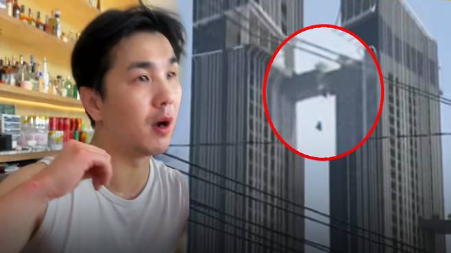 이 남성은 오른쪽 건물에 태국인 아내와 어린 딸과 살고 있는데, 왼쪽 건물에 있는 헬스클럽에서 운동을 하다가 지진이 감지되자 가족에게 달려가기 위해 몸을 사리지 않고 달린 것이죠.