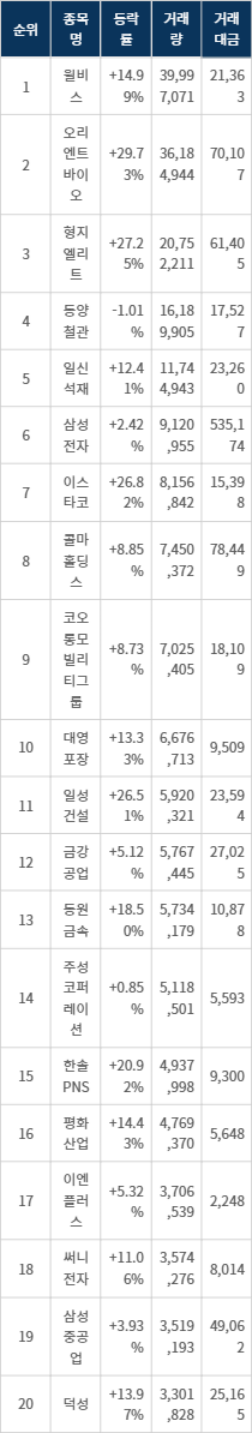 한편 거래량 상위 20위권 종목들은 일성건설(013360) ▲26.51%, 금강공업(014280) ▲5.12%, 동원금속(018500) ▲18.50%, 주성코퍼레이션(109070) ▲0.85%, 한솔PNS(010420) ▲20.92%, 평화산업(090080) ▲14.43%, 이엔플러스(074610) ▲5.32%, 써니전자(004770) ▲11.06%, 삼성중공업(010140) ▲3.93%, 덕성(004830) ▲13.97% 등의 성적을 기록했다.