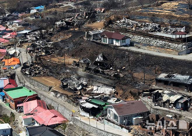 [영덕=뉴시스] 이무열 기자 = 1일 경북 영덕군 영덕읍 노물리 마을이 산불로 전소돼 폐허가 되어 있다. 2025.04.01. lmy@newsis.com