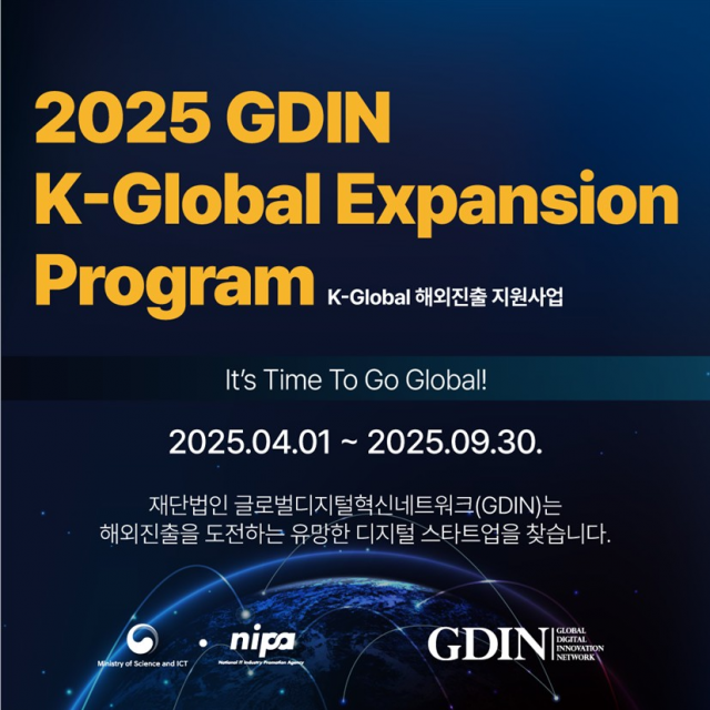 글로벌디지털혁신네트워크(대표 김종갑, 이하 GDIN)가 4월 1일부터 디지털 혁신 기술기업들의 글로벌 시장 진출을 지원하는 ‘2025년 K-Global 해외진출 지원사업’에 참여할 기업들을 모집한다. GDIN은 디지털 혁신 기술기업들의 글로벌 진출을 지원하기 위해 과학기술정보통신부 산하에 설립된 민간 재단이다.