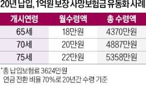 이를 월평균 수령액으로 환산하면 65세 개시는 18만원, 70세와 75세 개시는 각각 20만원, 22만원이다. 유족이 사망보험금을 아예 못 받는 것도 아니다. 1억원인 사망보험금의 70%만 유동화했기 때문에 나머지 3000만원은 사망보험금으로 지급된다.