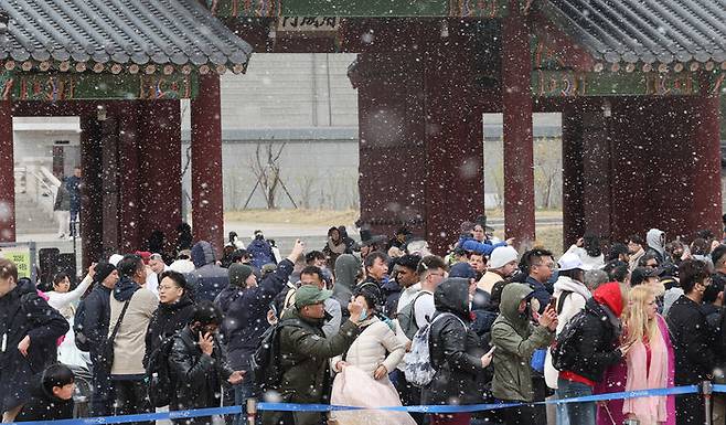 ▲ 서울에 눈이 내린 30일 서울 경복궁에서 관광객들이 수문장 임명 의식을 지켜보고 있다.