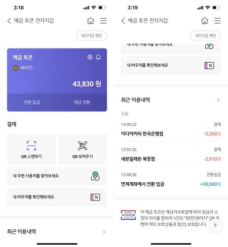 실거래 테스트를 위해 먼저 전자지갑을 개설했다. 신분증을 갖고 있다면 은행 앱에서 비대면으로 가능했다. 전자지갑이 만들어지면 예금 계좌에 있는 돈을 디지털 화폐인 '예금 토큰'으로 전환하면 된다. 한도는 100만원인데 우선 5만원만 토큰으로 바꿨다. 쓰고 남은 토큰은 다시 내 계좌 예금으로 입금할 수 있다.