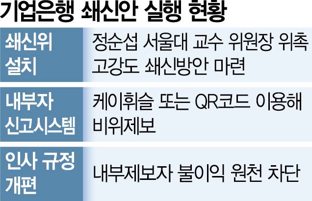 기업은행은 또 현직 임직원뿐만 아니라 전직 임직원 및 외부인도 위법·부당행위를 제보할 수 있도록 내부자 신고제도를 개선하고 제보자들이 받을 수 있는 불이익을 원천적으로 차단하기로 했다. 이를 통해 내부·외부 신고를 활성화할 계획이다. 기업은행의 한 관계자는 “쇄신위가 일회성에 그치지 않고 신속하고 지속적인 쇄신 계획 실행을 위해 회의를 수시로 개최하기로 했다”며 “쇄신안의 조기 정착을 위해 최선을 다할 것”이라고 설명했다.