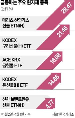 1일 한국거래소에 따르면 ‘KODEX 구리선물(H) ETF’는 올해 들어 21.46% 상승했다. 미국 뉴욕상품거래소의 구리 선물 가격은 지난달 26일 한때 파운드당 5.3달러를 웃돌며 사상 최고치를 기록했다. ‘ACE KRX금현물 ETF’와 ‘KODEX 은선물(H) ETF’는 연초 대비 각각 16.08%, 14.86% 올랐다. ‘메리츠 천연가스 선물 상장지수증권(ETN)(H)’(28.47%) ‘신한 브렌트원유 선물 ETN(H)’(4.77%) 등 에너지 관련 상품 가격도 뛰고 있다.
