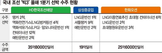 1일 업계에 따르면 올해 1·4분기 국내 조선 빅3의 수주 총액은 80억4000만달러로 집계됐다.