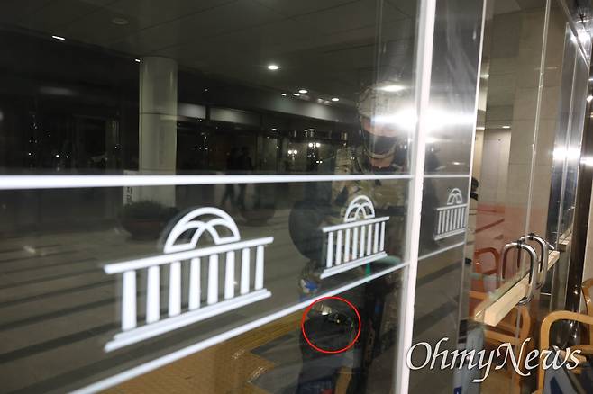 | ▲ 윤석열 대통령이 비상계엄을 선포한 지난해 12월 3일 오후 무장한 계엄군이 국회 본청 출입을 막기 위해 청테이프로 문을 걸어 잠그고 있다. 육군특수전사령부 707특수임무단(707특임단) 소속으로 확인된 대원이 오른쪽 허벅지 벨트에 수갑 대용으로 쓰이는 케이블타이(빨간색 원)를 휴대하고 있다. |
