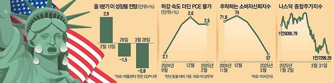 미국의 자산시장이 자산의 위험성 수준에 따라 이처럼 극명하게 대비되는 이유는 트럼프 대통령의 관세 정책이 인플레이션은 재발시키고 경기는 침체시킬 수 있다는 우려 때문이다. 관세전쟁으로 미국 내 물가 상승은 불가피하다는 관측인 가운데 가계 소비와 기업 투자 심리는 악화되고 있어 이른바 스태그플레이션(물가 상승 속 경기침체) 공포가 확산되는 분위기다.