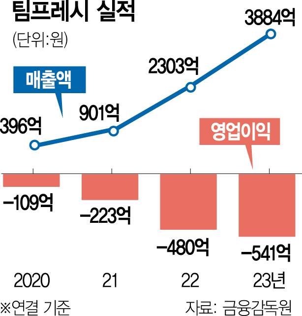 2018년 창업한 팀프레시는 첫 해 27억 원의 매출을 올린 후 빠르게 성장하며 2023년 3884억 원의 매출을 기록했다. 지난해 매출은 5400억 원인 것으로 알려졌다. 하지만 영업손실도 2023년 541억 원에서 지난해 781억 원으로 계속 확대되는 모습이다. 최대 주주는 KT이며 2대 주주는 창업자인 이성일 대표다. 2022년 시리즈D로 1320억 원 등 누적 투자 총 2000억 원을 유치했다. 지난해 초부터는 시리즈E 투자 라운드로 흑자 전환을 이루며 추가 자금조달 없이 기업공개(IPO)를 추진해왔다.