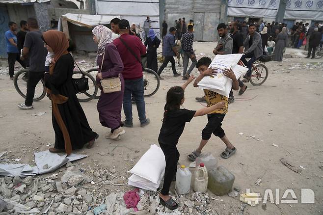 [자발리아=AP/뉴시스] 1일(현지 시간) 가자지구 자발리아에서 팔레스타인 어린이들이 유엔팔레스타인난민기구(UNRWA)가 배포하는 밀가루 포대와 기타 인도적 지원 물품을 받고 있다. 2025.04.02.