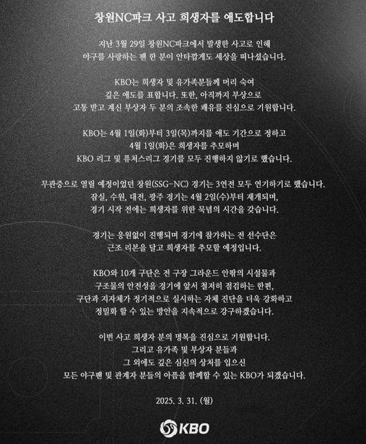 창원NC파크의 구조물 추락으로 관중 한 명이 세상을 떠나는 충격적인 사고를 애도하며 잠시 중단됐던 KBO리그가 2일 재개된다.