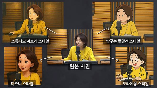 ◆ 김덕진> 그렇죠, 디즈니 스타일로 바꿔줘. 도라에몽 스타일로 바꿔줘. 그럼 저렇게 그려주는데 여기서 중요한 포인트가 뭐냐면 캐릭터 이제 우리가 있는 이제 MC의 것만 바꿔주는 게 아니라 저 뒷모습을 보세요. 그러니까 저 배경이나 마이크나 환경 같은 거 이미지 이런 거를 다 정확하게 바꿔준다는 거예요.