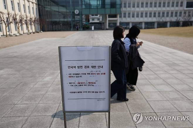 (서울=연합뉴스) 윤동진 기자 = 윤석열 대통령 탄핵 선고를 이틀 앞둔 2일 서울 종로구 서울 공예박물관에 안국역 방면 경로 제안 안내문이 설치돼 있다. 2025.4.2