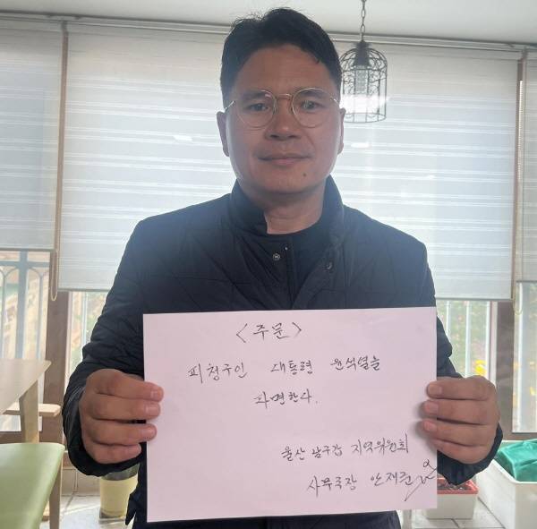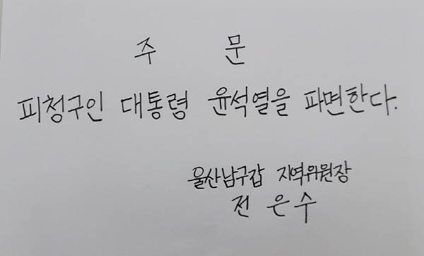 | ▲ 더불어민주당 울산 남구갑 전은수 위원장dl 3월 16일 손글씨로 쓴 '주문, 피청구인 대통령 윤석열을 파면한다' 는 문구 |