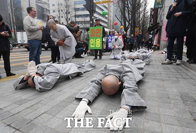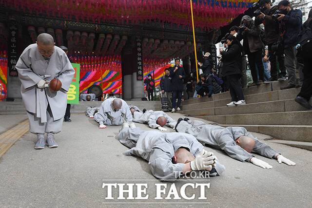 스님들과 재가불자 30여 명이 참석한 오체투지는 조계사 대웅전 앞에서 시작해 안국역 앞까지 이어졌다.