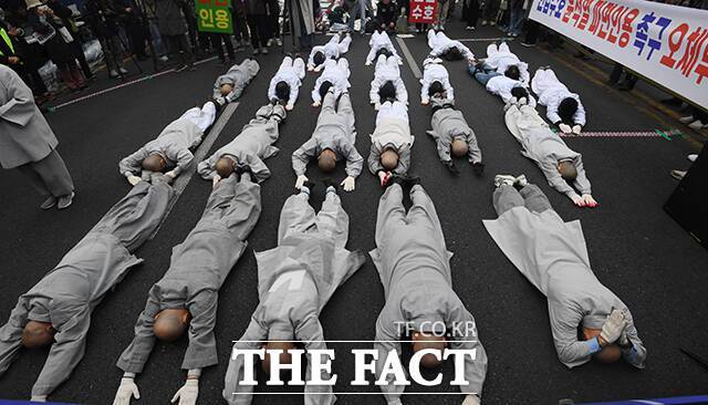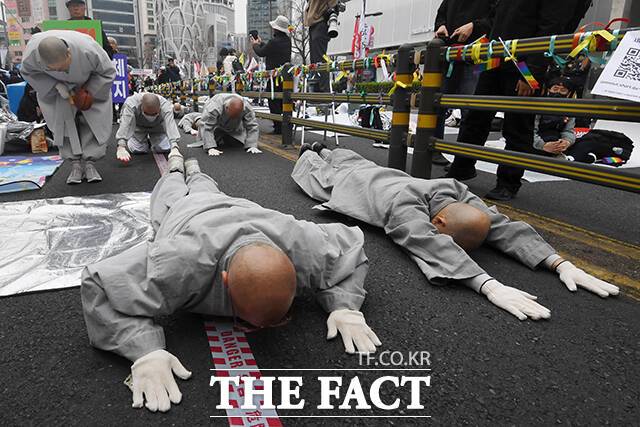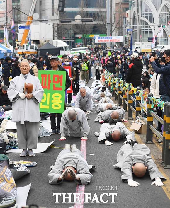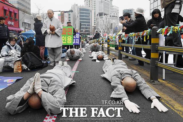 '尹 파면 촉구 오체투지' 봉행하는 조계종 스님들 [TF포착]