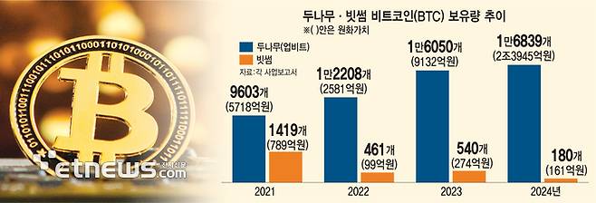 가상자산 거래소 업비트를 운영하는 두나무 4분기 보고서에 따르면 연결기준 두나무가 보유한 비트코인(BTC)은 1만6839개로 원화로 환산하면 2조3945억원 수준이다. 해당 기간 두나무 당기순이익 9881억원의 2배에 달한다.