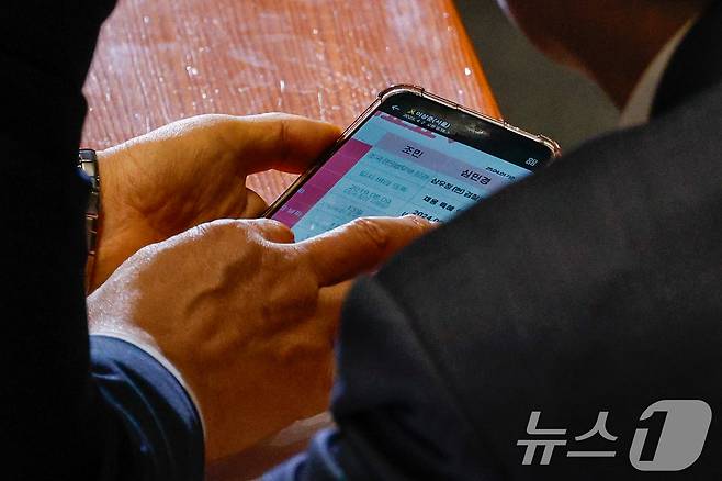(서울=뉴스1) 안은나 기자 = 정청래 국회 법제사법위원장이 2일 오후 서울 여의도 국회에서 열린 제423회국회(임시회) 제3차 본회의에서 이재명 더불어민주당 대표, 김민석 최고위원과 대화하며 조국 전 조국혁신당 대표 딸과 심우정 검찰총장 딸 의혹 비교 휴대폰 화면을 보여주고 있다. 2025.4.2/뉴스1