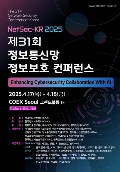 한국정보보호학회(KIISC)가 한국인터넷진흥원(KISA)와 함께 오는 17일부터 18일까지 서울 강남구 코엑스에서 '제31회 정보통신망 정보보호 콘퍼런스(NetSec-KR) 2025'를 개최한다.