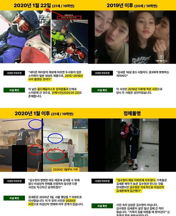 2015년~2016년 촬영됐다는 스키장 사진에 대해서는 "2020년 1월 골드메달리스트 임직원들과 단체로 간 것으로 단체 사진도 존재한다"고 반박했다. 김수현이 하체가 노출됐던 사진 역시 "김새론은 2020년 1월 행당동 T아파트로 이사했다. 2020년 사진으로 미성년자 연애와 아무 관계가 없다"라고 강조했다.