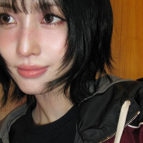 꾸밈 단계를 한 단계 더 올리고 싶은 날에는 모모처럼 펄을 활용한 베리 메이크업도 시도해 보자. 모모는 은은한 펄 베이스에 하이라이터, 블러셔, 주근깨 메이크업을 과하지 않게 완성했는데, 여기서도 물먹 립이 전체적인 룩을 해치지 않고 자연스럽게 어우러진다. 코의 중앙을 가로지르는 블러셔를 경계로 코의 하이라이터와 눈 밑 섀도가 이목구비를 더욱 입체적으로 돋보이게 만드는 효과까지 더해준다.