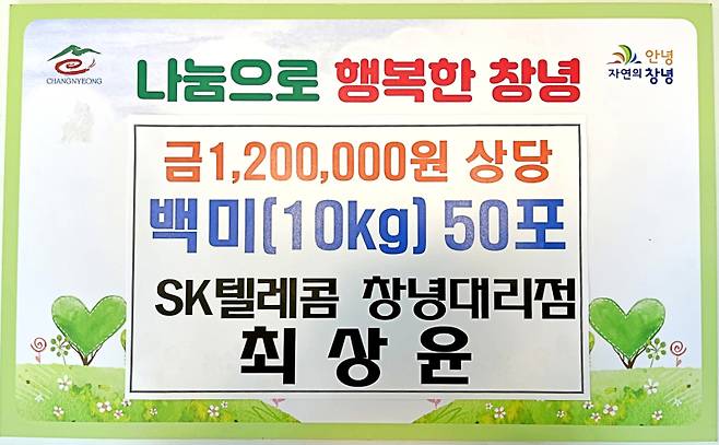 SK텔레콤 창녕대리점을 운영 중인 최상윤 씨가 이웃돕기 백미 50포를 기탁했다.