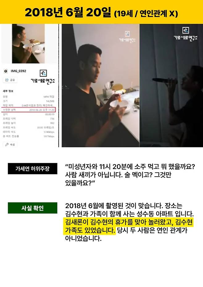 김수현 측은 미성년자와 11시 20분에 한 데이트라고 공개된 영상에 대해 "2018년 6월에 촬영된 것이 맞다"며 장소는 김수현이 가족과 함께 사는 아파트였다고 밝혔다.