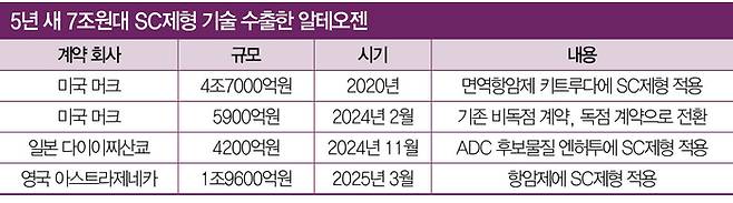 알테오젠이 최근 5년 새 SC제형을 기술 이전한 총금액은 7조6700억원에 달한다. 3월 초에는 영국 아스트라제네카와 SC제형 항암제를 개발하는 계약을 맺었는데 총 2조원에 달하는 거래였다. 즉시 수령 계약금만 660억원이다. 알테오젠은 지난해 11월 일본 다이이치산쿄와 항체약물접합체(ADC) 항암제인 ‘엔허투’에 SC제형 변경 기술을 적용하기로 하며 4200억원대 계약을 맺은 이후 4개월여 만에 추가로 기술 수출에 성공했다. 현재 글로벌 제약·바이오 업계 최대 화두인 신규 모달리티(치료접근법) ADC를 SC제형으로 개발하는 것은 알테오젠이 세계 최초다.